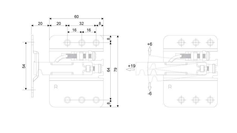 Модель допускает два вида монтажа — вкручивание в предустановленную футорку (12 футорок идут в комплекте) или в пласть. Оба вида монтажа одинаково надёжные и выбираются исходя из предпочтений мебельщиков.