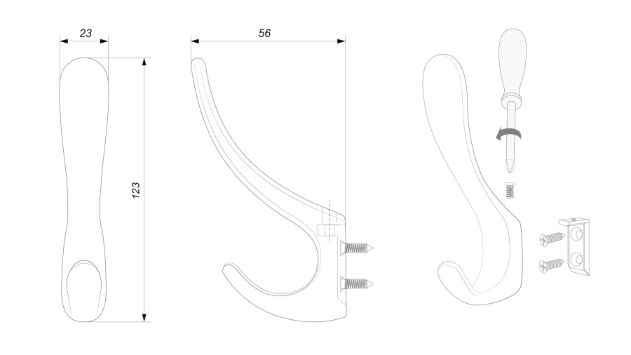 Монтаж крючка достаточно прост и обеспечивает плотную установку, исключая соскальзывание в любой ситуации: крепление планки к мебели производится с помощью саморезов, а затем на неё надевается крючок при помощи винта, без каких-либо следов установки.